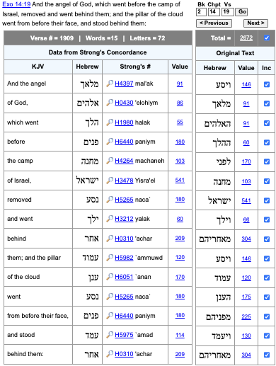 2672 is the value of the 72 First Letters of the 72 Triplets. It is also (er, “obviously”), the value of the 15 Words of Exodus 14:19, i.e. the verse where God “stashed” those 72 First Letters The verse describes The Angel of God, “changing position” from in front of the Israelites, to go to a position “behind” them, i.e. to where the “Angel” was between the Israelites and the pursuing Egyptian Army.